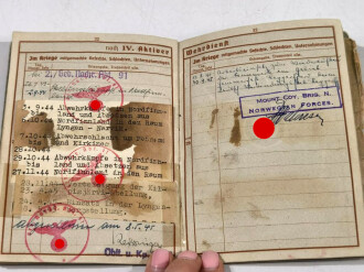 Wehrpaß eines Angehörigen zuletzt 2./ Gebirgs Nachrichten Abteilung 91 in Norwegen. Eingetragenes Lapplandschild, diverse Gefechte in Norwegen eingetragen