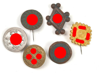 Winterhilfswerk Reichsstrassensammlung, Schmuck alter Kulturvölker mit Hakenkreuz Symbol, 6 verschiedene Abzeichen