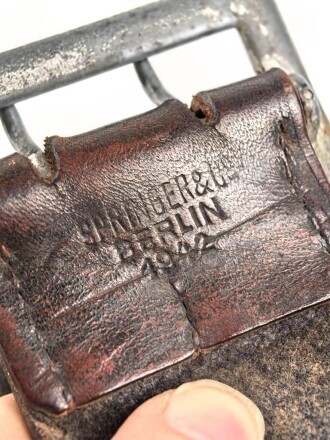 Zweidornkoppel für Offiziere der Luftwaffe. Dunkelbraunes Leder, Höhe 58mm, Gesamtlänge 103cm, datiert 1942